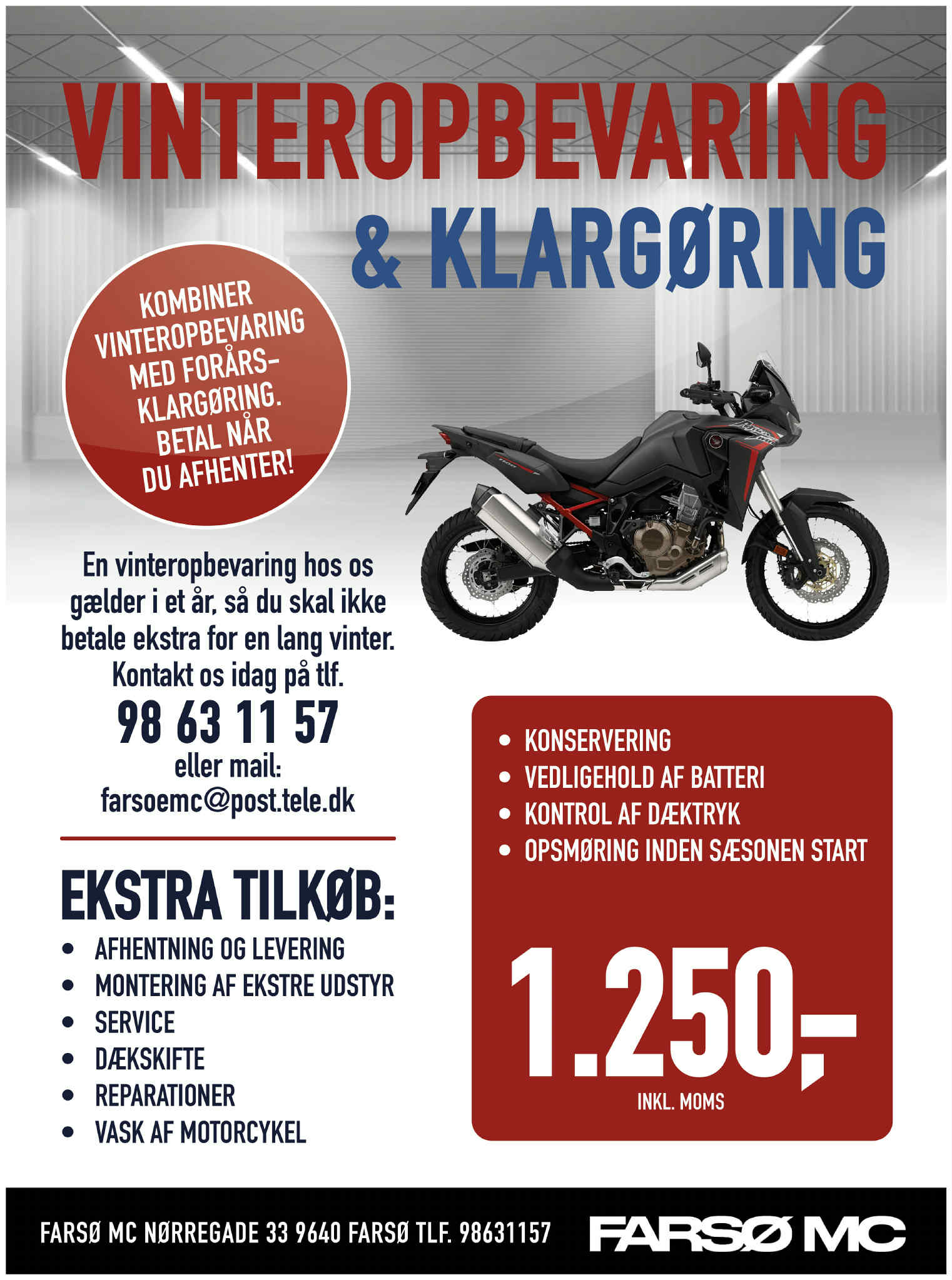 Vi tilbyder vinteropbevaring af din MC, vi opbevarer din motorcykel i frost fri lokaler. Mangler du plads der hjem eller har du ikke mulighed for at sætte din MC i læ for vind og vejr.? Så kom ned til os og vi passer på din motorcykel i vintermånederne. Prisen for en vinteropbevaring hos os er Kr. 1250,- inkl. moms. En vinteropbevaring hos os gælder i et år, så du skal ikke betale ekstra for en lang vinter.